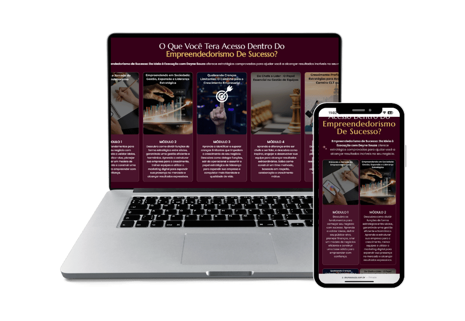 Agora, através do Curso de Empreenda com Propósito, Deyne está pronta para te guiar na construção de uma carreira sólida e alinhada ao seu propósito. Seja você uma mulher que sonha em iniciar um negócio ou alguém que já possui uma empresa e deseja expandir, Deyne vai te ensinar passo a passo como crescer, escalar e criar um impacto real com seu trabalho.